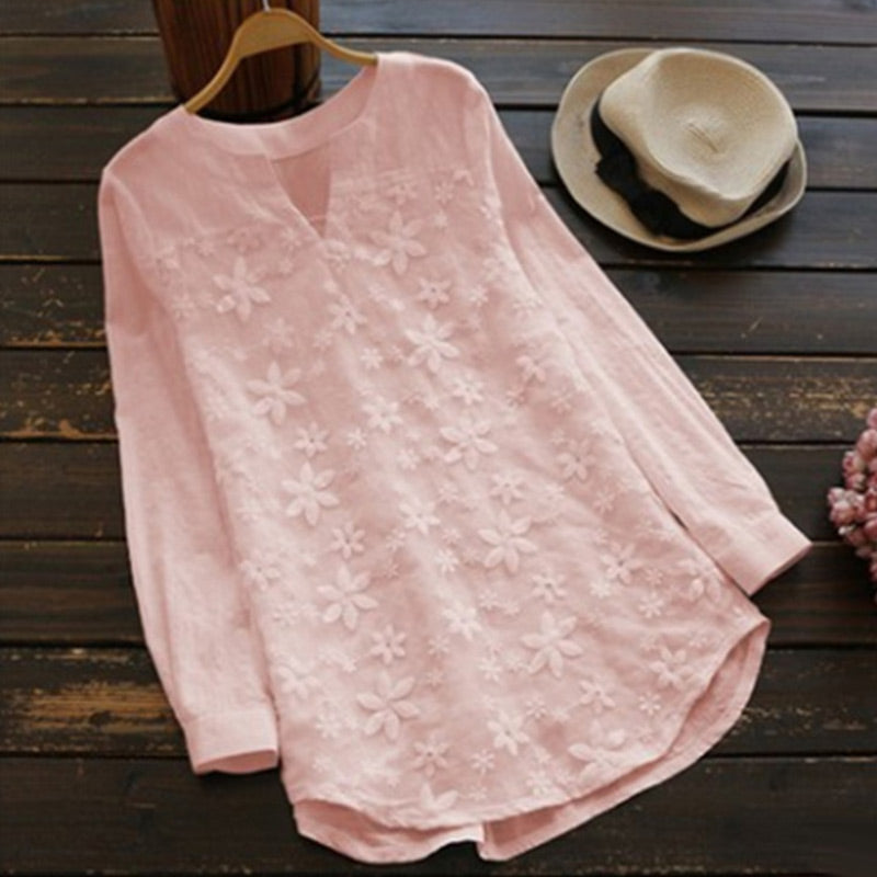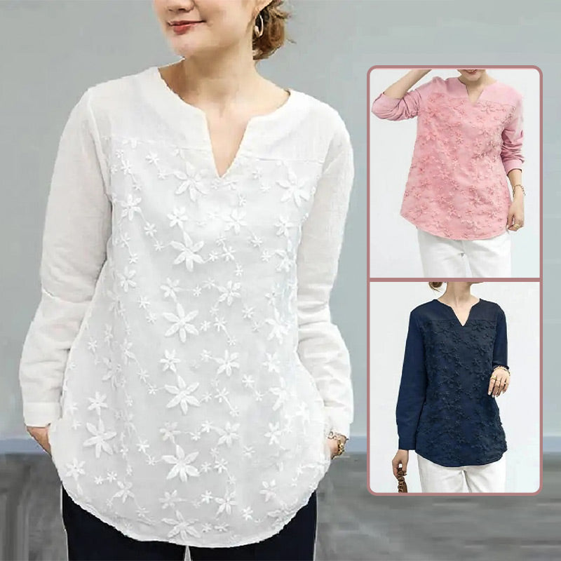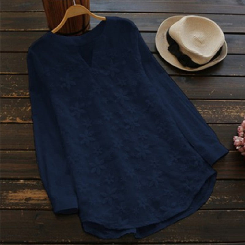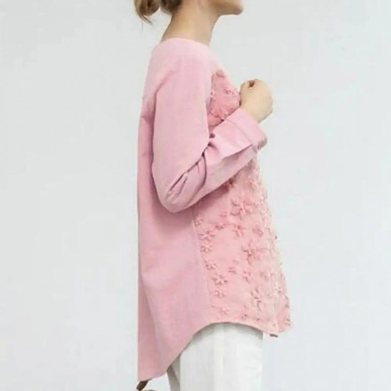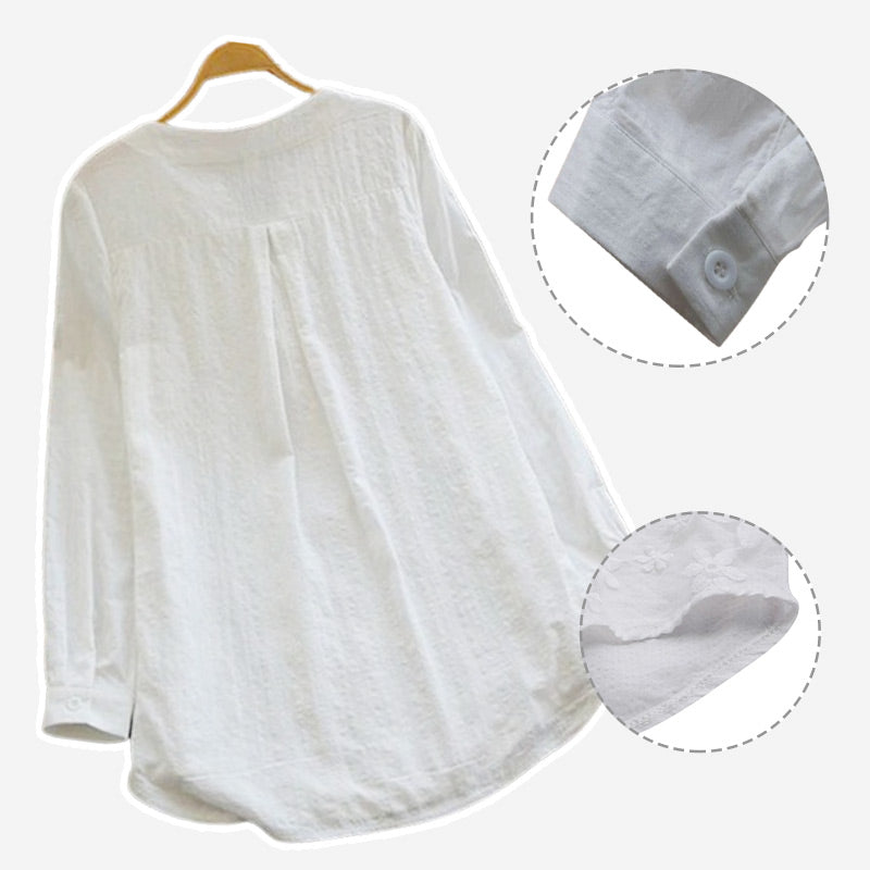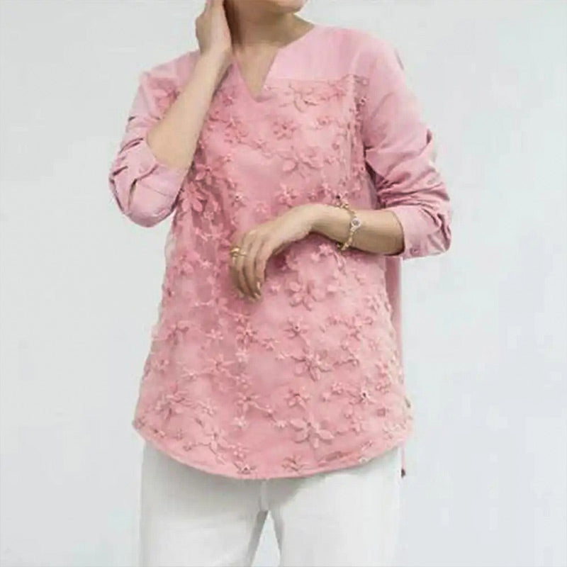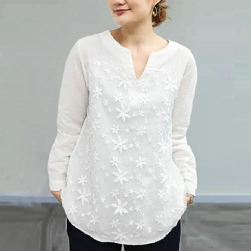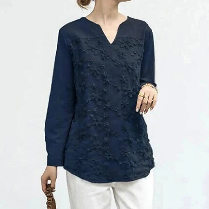 Enfärgad långärmad blus för kvinnor med spetsbroderi