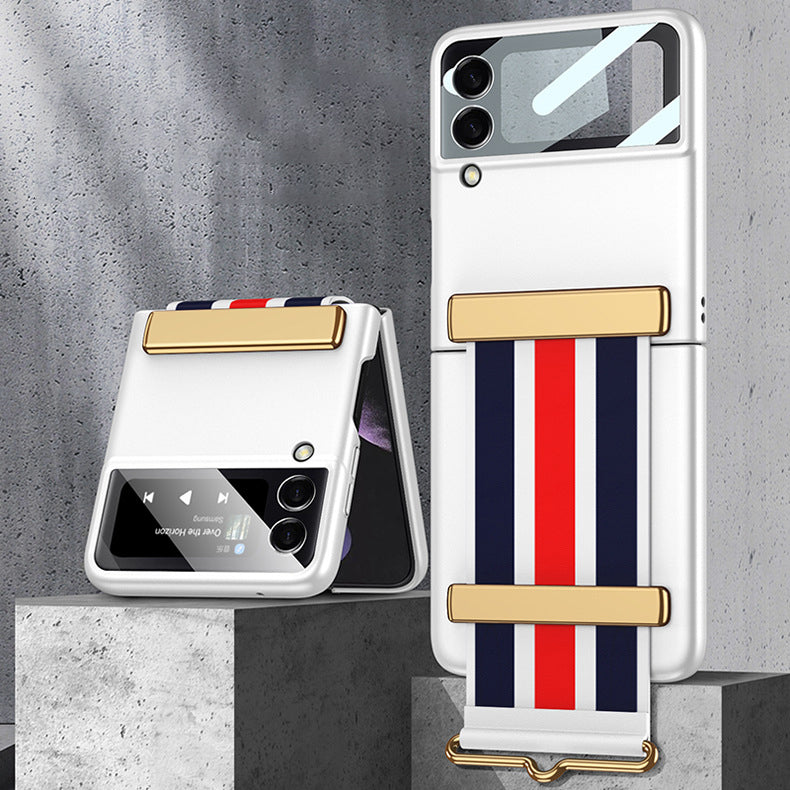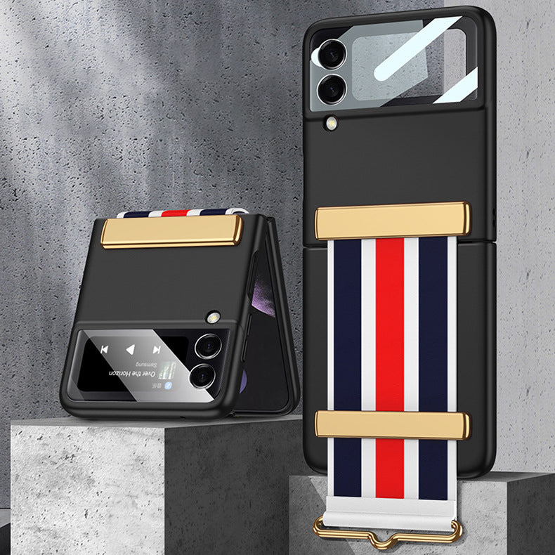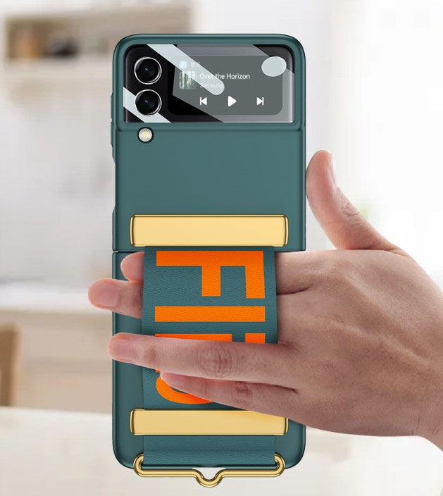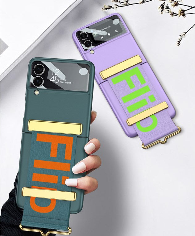 Armband och skyddsgångjärn: Denna rem kan användas som ett bekvämt armband när telefonen är öppen. Du kan hänga telefonen på handen för att förhindra att den faller. Den kan även användas som ett mobiltelefonfäste för att frigöra händerna. När telefonen är stängd blir denna rem ett skyddande gångjärn, vilket gör anslutningen starkare.